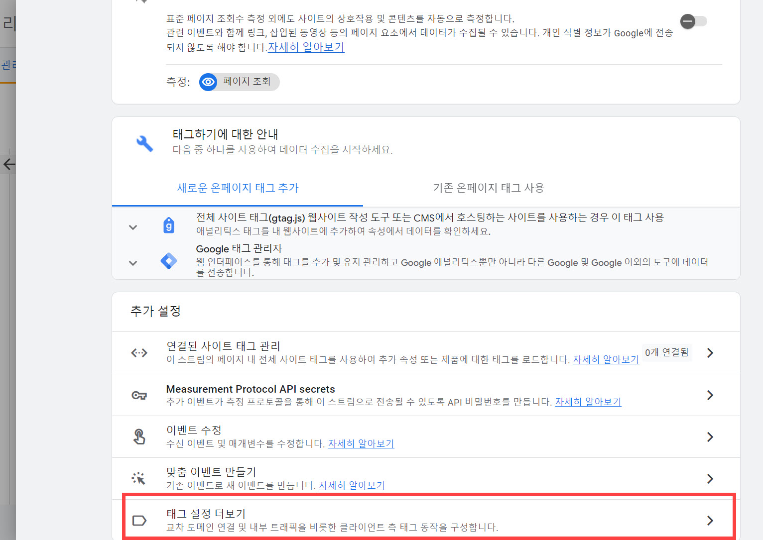 3. 화면을 아래로 스크롤하여 "추가 설정" 섹션의 "태그 설정 더보기"를 클릭합니다.