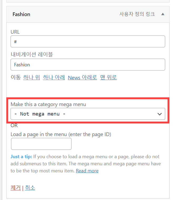 2. 메뉴 항목 설정 화면이 표시되면 Make this a category mega menu (이 카테고리를 메가 메뉴로 만들기)에서 카테고리를 선택하거나 Load a page in the menu (enter the page ID)에 페이지 ID를 입력하여 메뉴에 페이지를 로드할 수 있습니다.