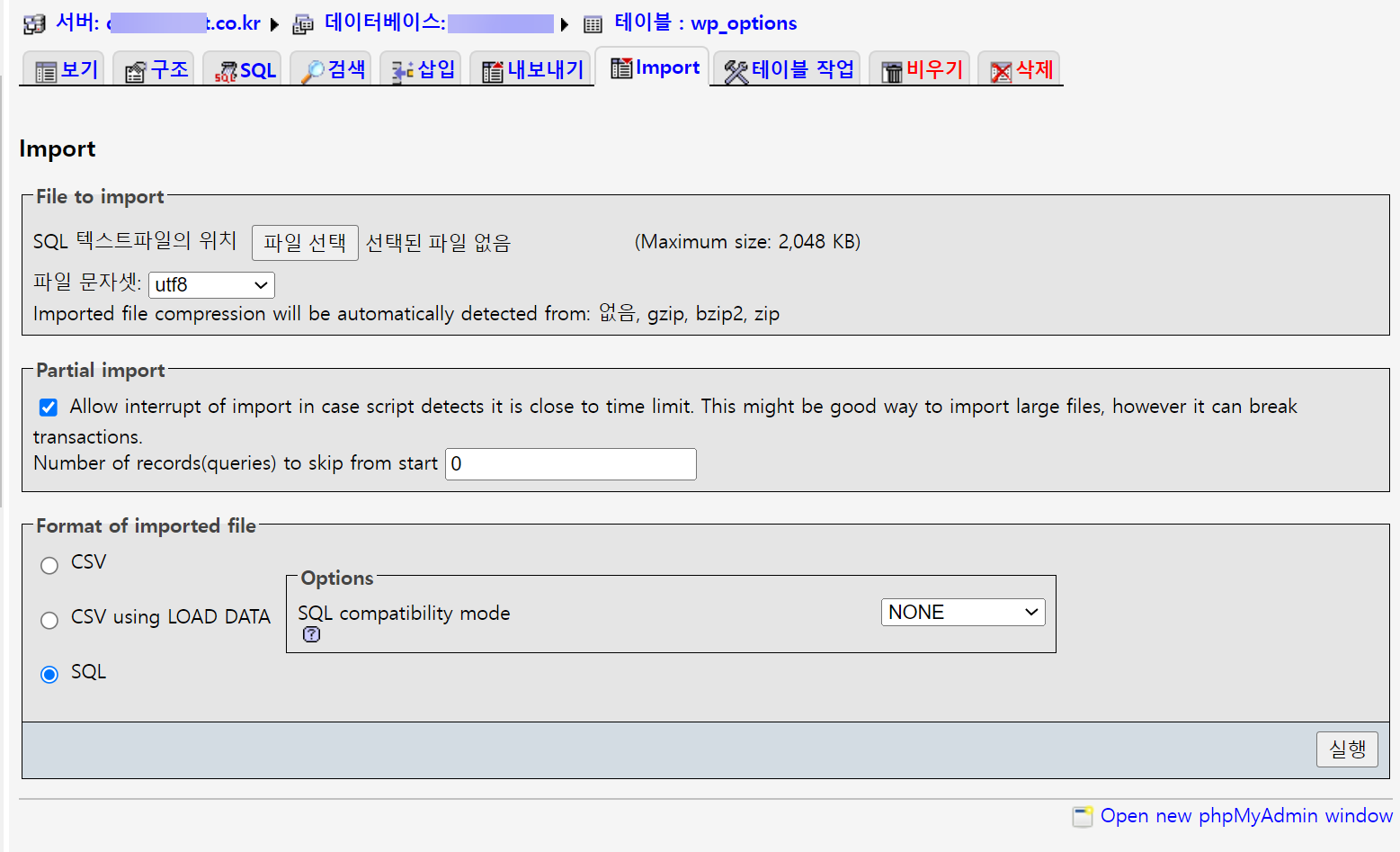 아이네임즈에서 phpMyAdmin에 접속해보니 임포트 가능한 최대 크기가 2MB 정도에 불과했습니다.ㅠ