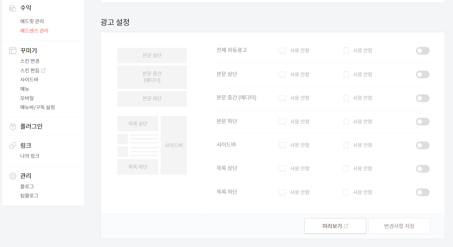 저는 애드센스 관리 페이지의 광고 설정에서 모든 광고를 비활성화(OFF)했습니다.