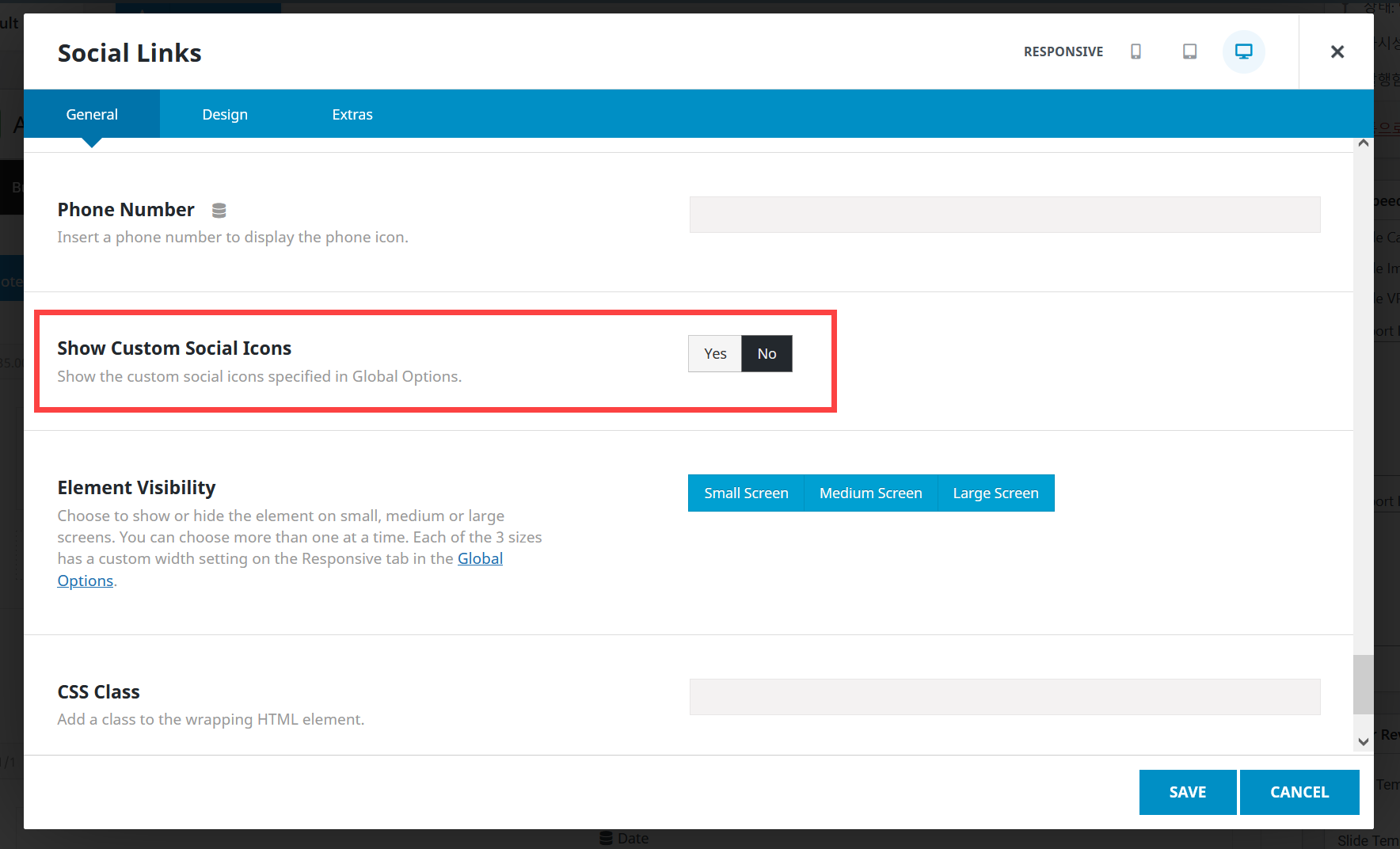 Show Custom Social Icons(사용자 정의 소셜 아이콘 표시) 옵션을 Yes로 설정해야 커스텀 소셜 아이콘을 표시할 수 있습니다. 기본적으로 이 옵션은 아래 그림과 같이 No로 설정되어 있습니다. Yes로 전환합니다.