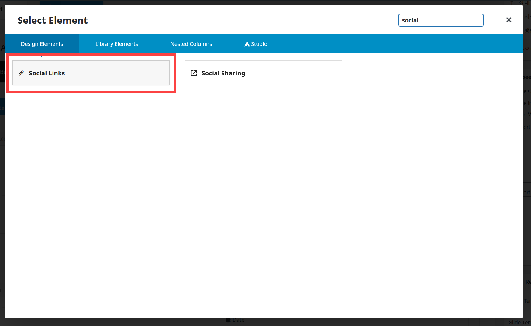 엘리멘트 선택 화면이 표시되면 Social Links 엘리먼트를 선택합니다.