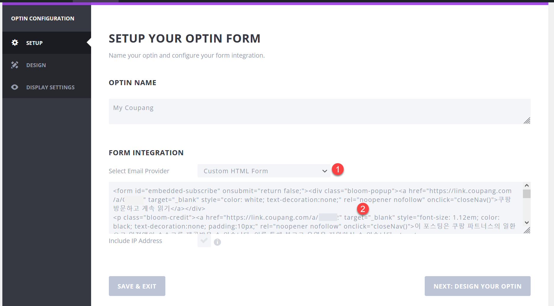 배너를 클릭해야 글을 읽도록 구현하려는 경우 Optin Configruation » Setup에서 다음 그림과 같이 Form Integration에 Custom HTML Form을 선택합니다.