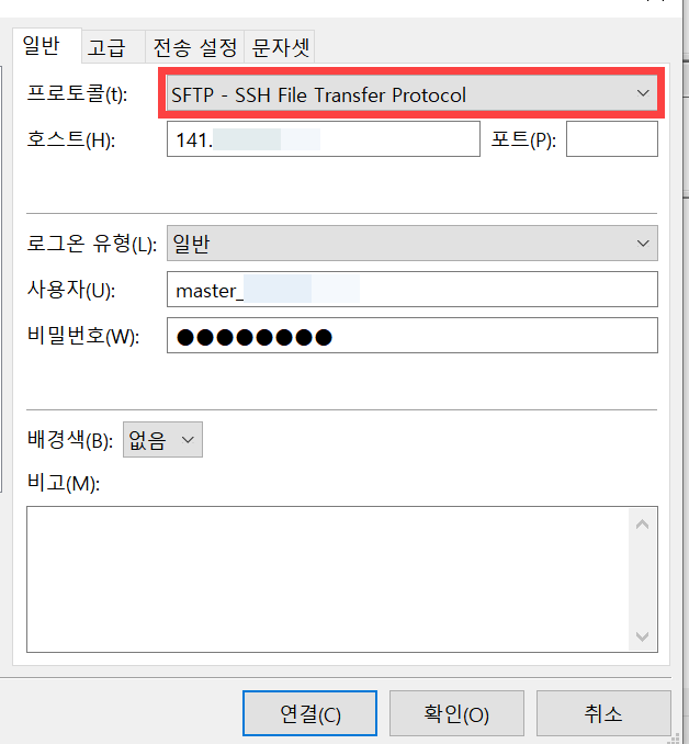 - 프로토콜: SFTP - SSH File Transfer Protocol을 선택합니다.