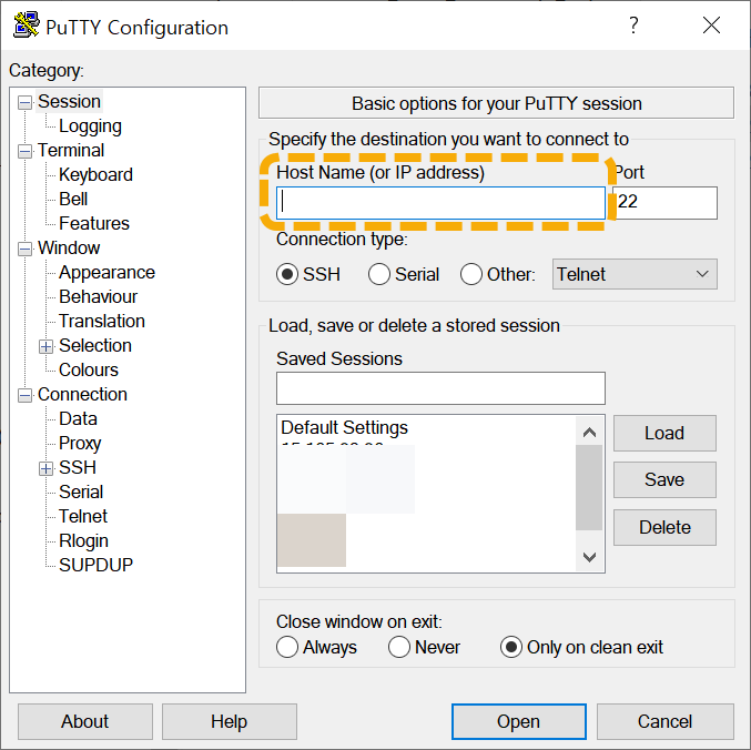 SSH 접속도 동일한 방법으로 가능합니다. PuTTY 프로그램을 실행하고 Host Name에 공인 IP 주소를 입력하고, 서버 관리 페이지에서 확인한 사용자명과 비밀번호를 사용하여 SSH에 접속할 수 있습니다.