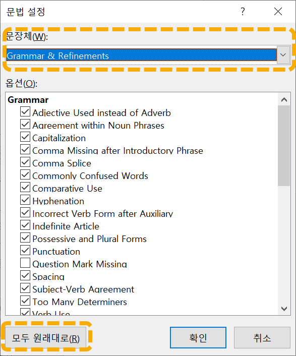 문장체에서 Grammar 또는 Grammar & Refinements를 선택하고 검사할 항목을 개별 지정하거나, 맨 아래의 "모두 원래대로" 버튼을 클릭하여 초기화할 수 있습니다.