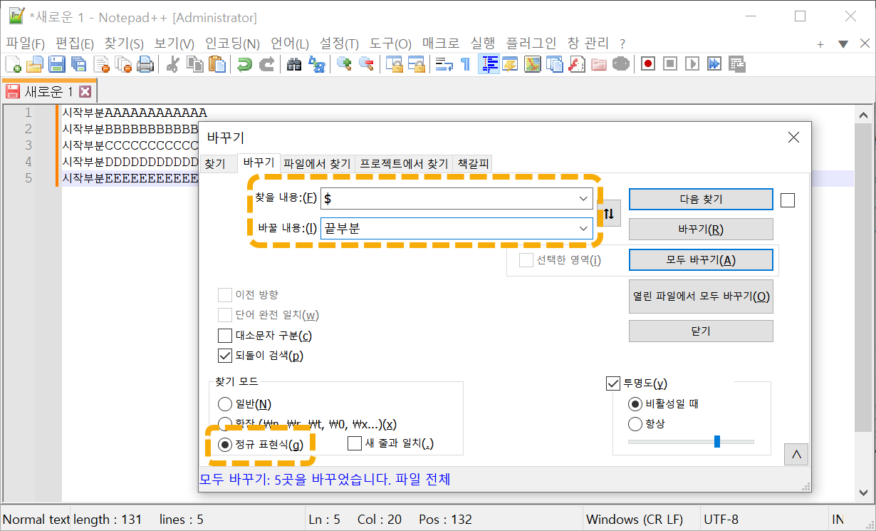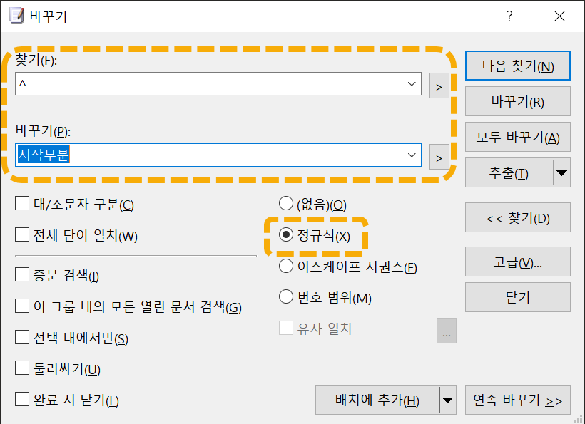 예를 들어, 모든 라인의 시작 부분에 특정 텍스트를 삽입하려는 경우 바꾸기 창에서 다음과 같이 설정하면 됩니다.