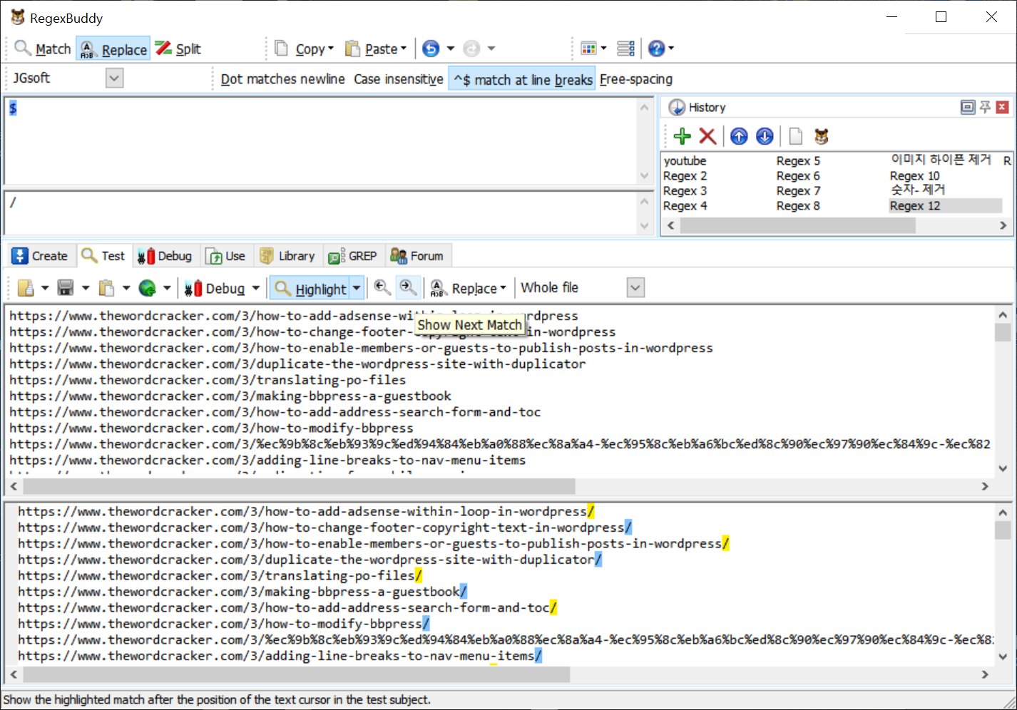 정규식을 자주 사용해야 하는 경우, RegexBuddy라는 프로그램을 이용하면 수월하게 정규식을 작성할 수 있습니다.
