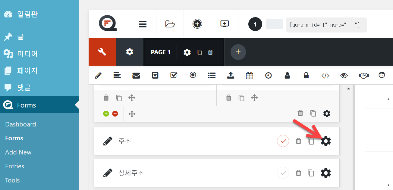 Quform에서 필드를 읽기 전용으로 설정하고 싶은 경우, 워드프레스 관리자 페이지 » Forms » Forms에서 해당 폼(Form)을 선택하여 편집 화면으로 이동한 다음, 읽기 전용으로 설정할 필드의 설정 아이콘(톱니바퀴 모양의 아이콘)을 클릭합니다.