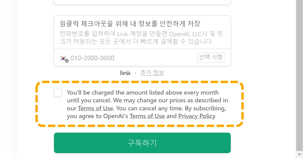 취소할 때까지 상기 금액이 매월 부과됩니다. 당사 이용약관에 명시되었듯이 당사는 요금을 변경할 수 있습니다. 귀하는 언제라도 취소할 수 있습니다. 구독함으로써 OpenAI의 이용약관과 개인정보 보호정책에 동의하게 됩니다.
