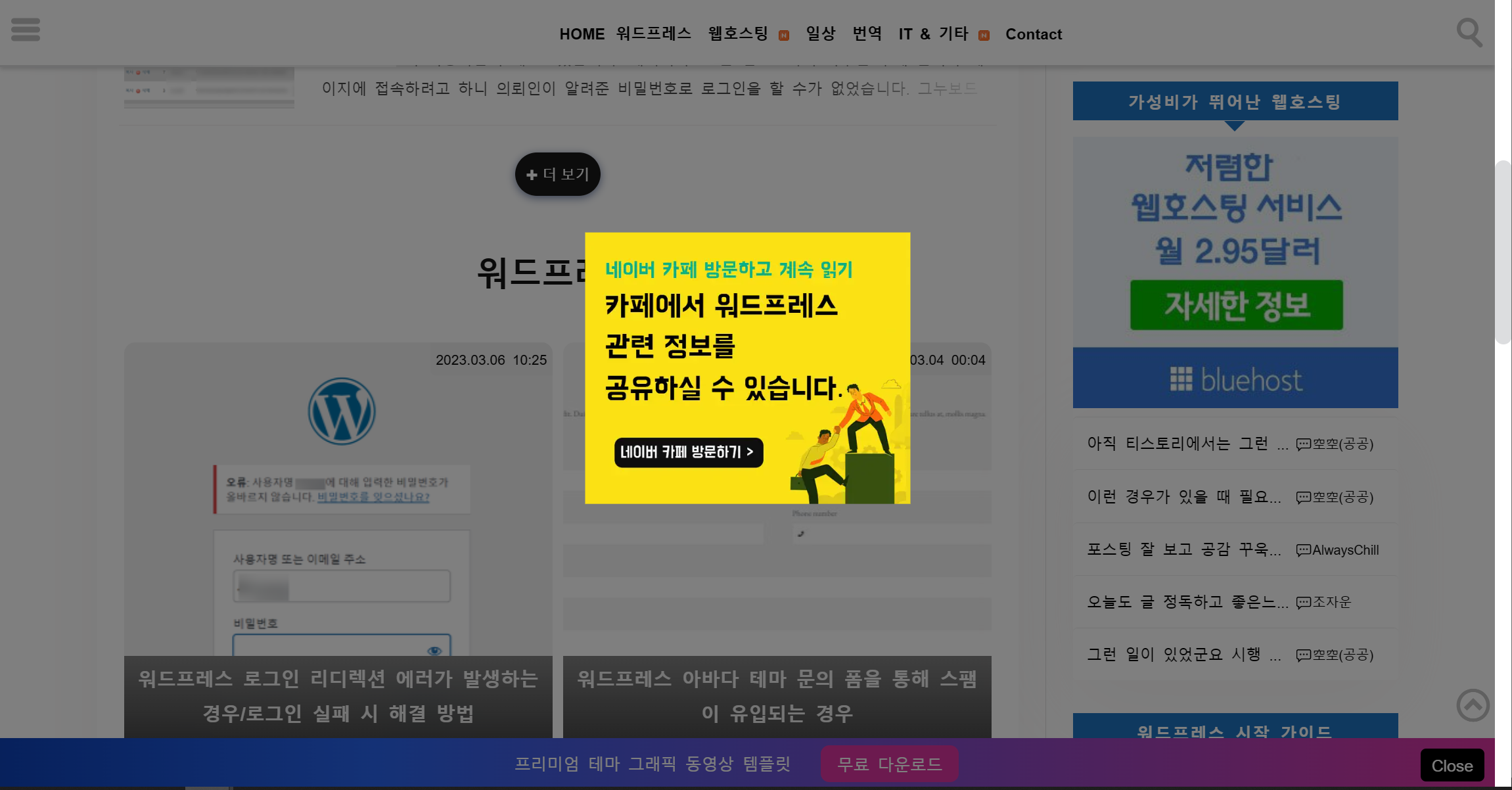 이 블로그와 워드프레스 정보꾸러미 블로그의 워드프레스 관련 카테고리 글에 (모바일 기기 제외) 네이버 카페 배너가 표시되고 있습니다.