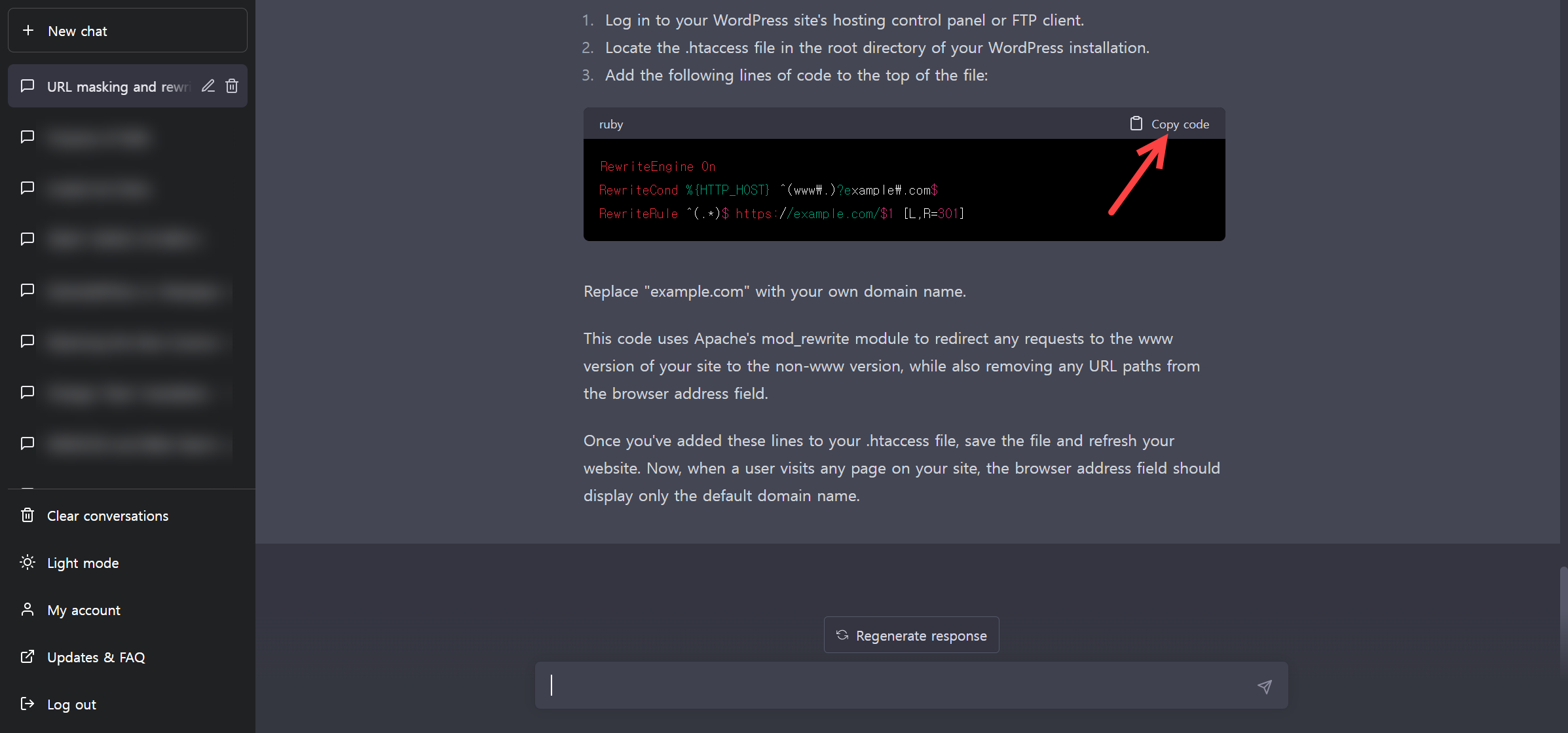 대화 내용 중에서 코드 부분은 Copy code를 클릭하여 클립보드에 복사할 수 있습니다.