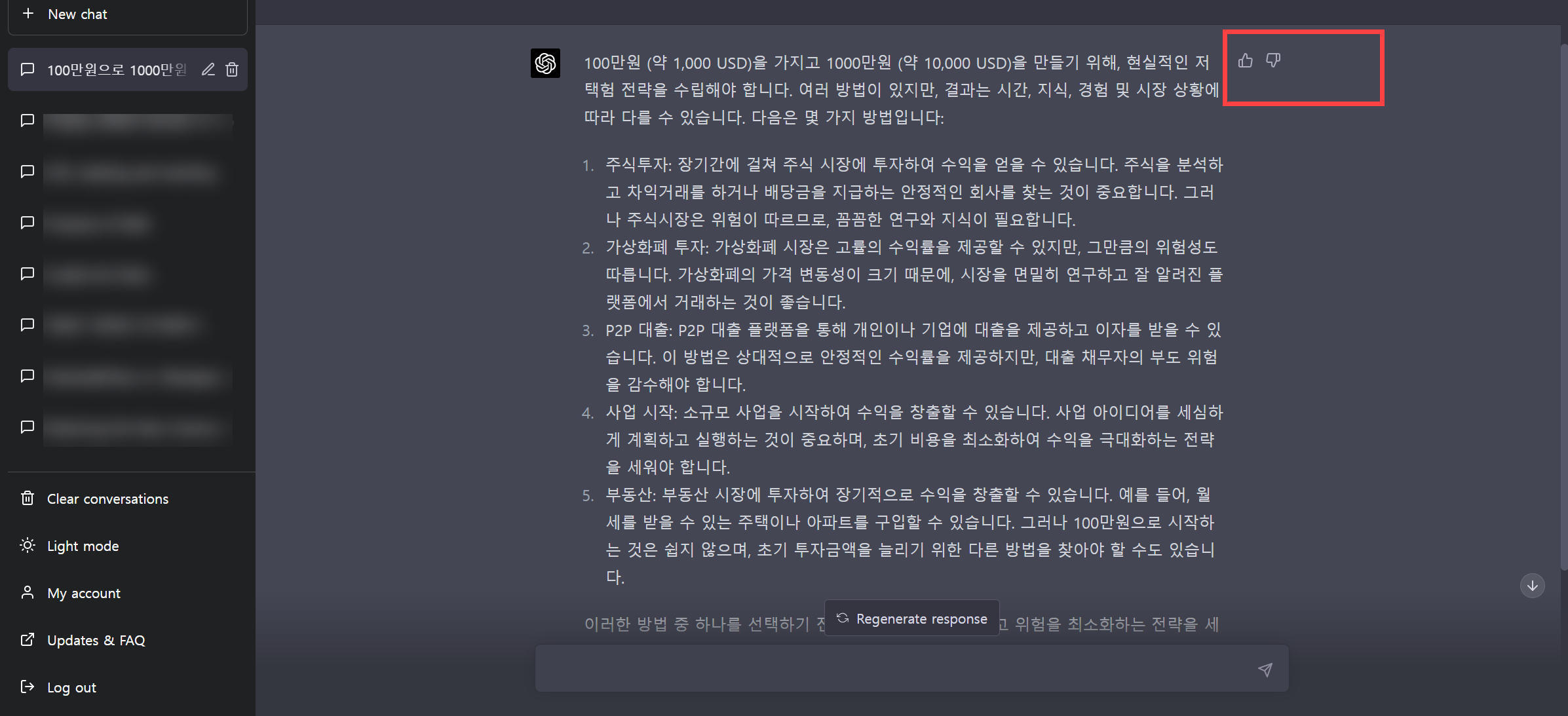 챗GPT를 통해 AI와 대화한 내용을 복사하려면 보통 마우스로 내용을 선택하여 복사할 것입니다. 답변 내용 옆에 추천/비추천 아이콘만 있고, 콘텐츠를 복사할 수 있는 옵션이 보이지 않습니다.