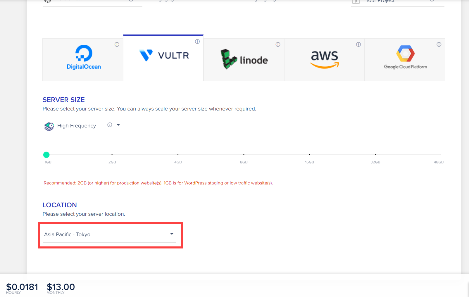 현재 클라우드웨이즈에서는 Vultr, High Frequency, 서울 리전을 일시적으로 사용할 수 없어 Vultr, High Frequency, 1GB, 도쿄 리전(Asia Pacific - Tokyo)을 선택하여 서버를 생성했습니다. 추후에 서울 리전을 사용할 수 있게 되면 서버를 클론(복제)하는 방식으로 서버 데이터센터 위치를 변경할 수 있습니다(참고).
