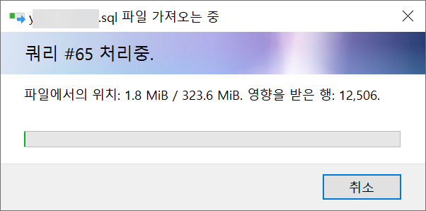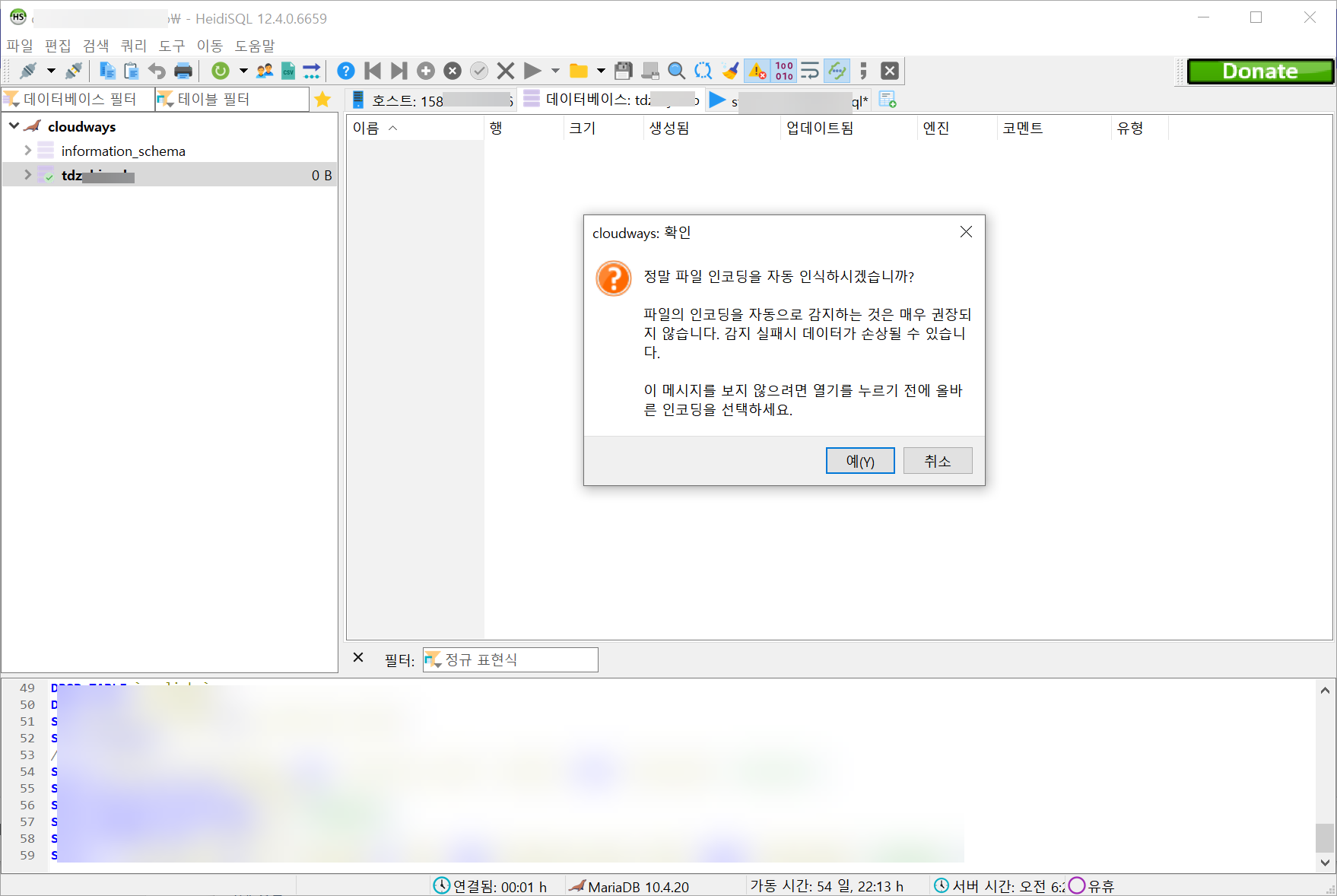 이번에는 HeidiSQL 프로그램을 사용하여 DB에 접속하여 디비를 업로드해 보았습니다. DB에서 사용되지 않는 디비 테이블을 삭제하여 디비 크기를 320MB 정도 크기로 줄인 후에 시도했습니다.