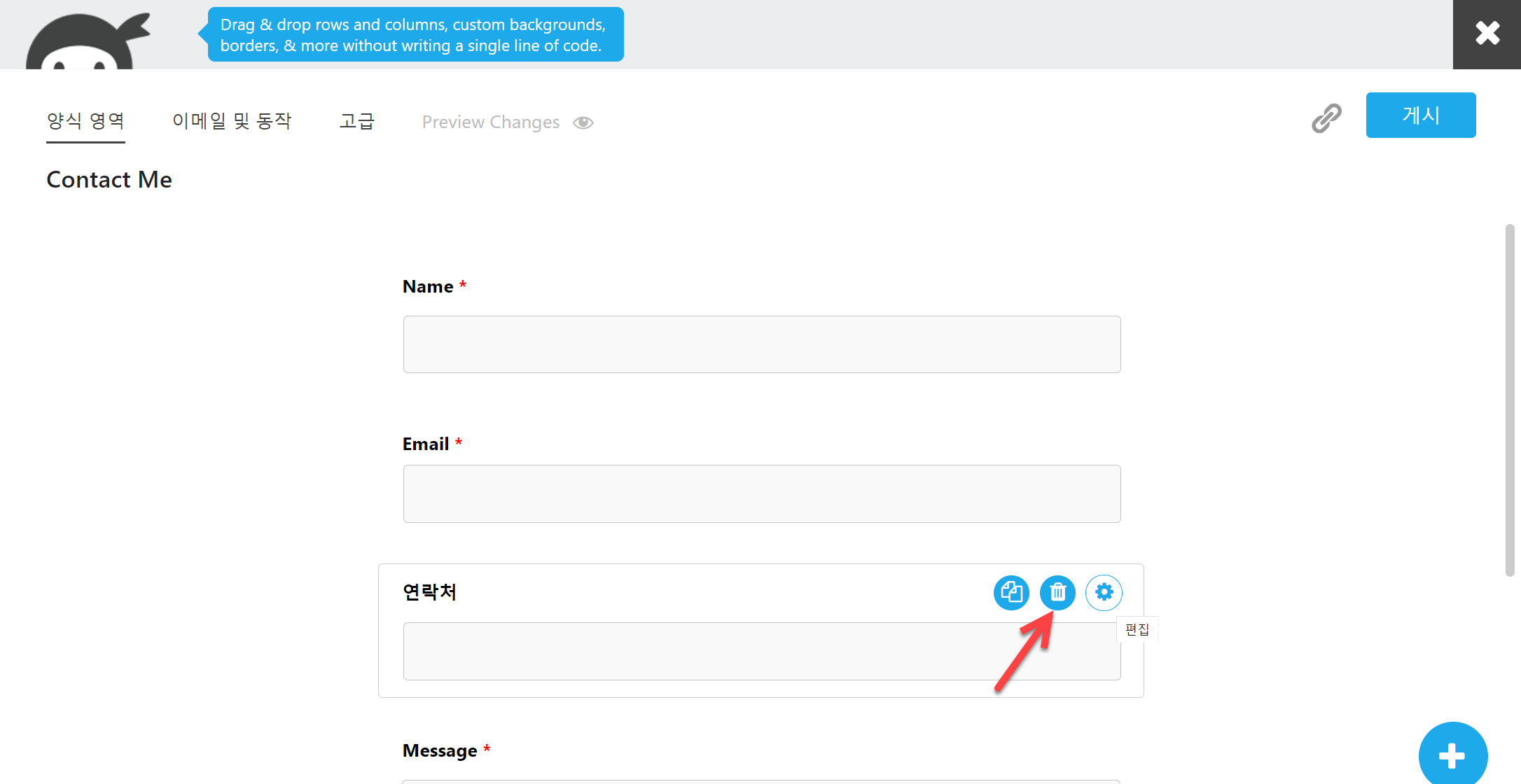 간단한 내용이지만 처음 닌자 폼 플러그인을 사용할 때 삭제 버튼을 찾지 못해 난감해 할 수 있습니다. 그런 경우 위의 방법으로 간단하게 삭제가 가능합니다.