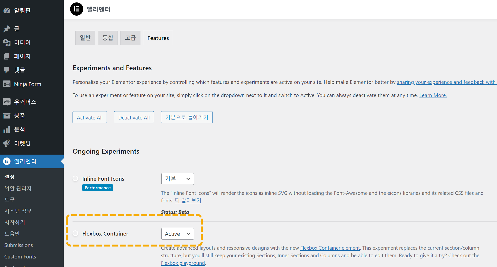 참고로 최근 엘리멘터가 업데이트되면서 알파 기능이었던 Flexbox Container(플렉스박스 컨테이너)가 Release andidate로 업그레이드되었습니다. 아직은 정식 기능이 아니지만 엘리멘터 » 설정 » Features 탭에서 이 기능을 활성화(Active)할 수 있습니다.