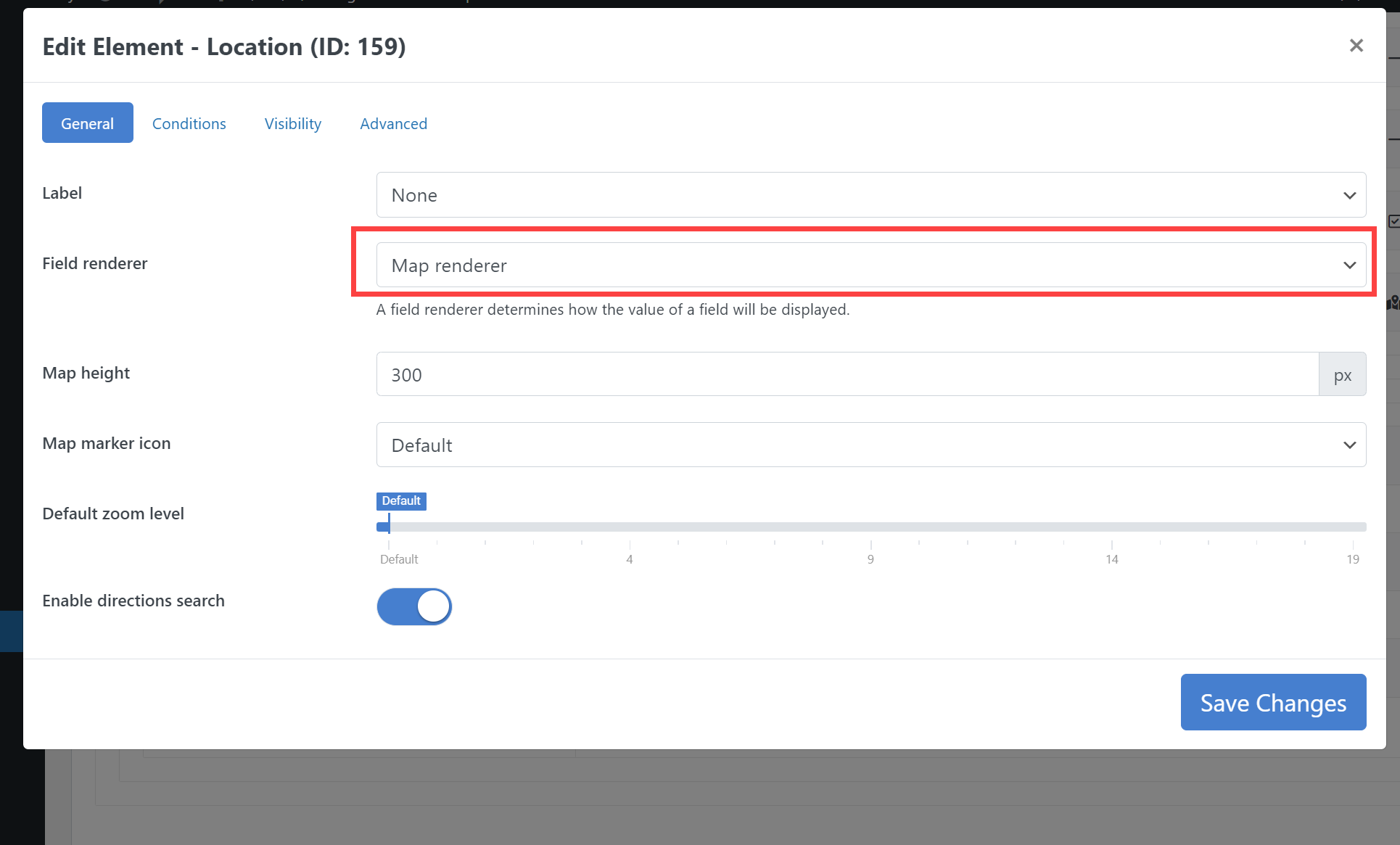 엘리멘트 편집 화면에서 Field renderer 필드 옵션에 Map renderer를 선택합니다.