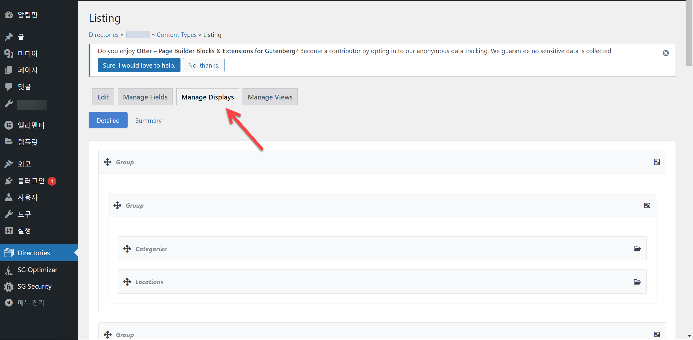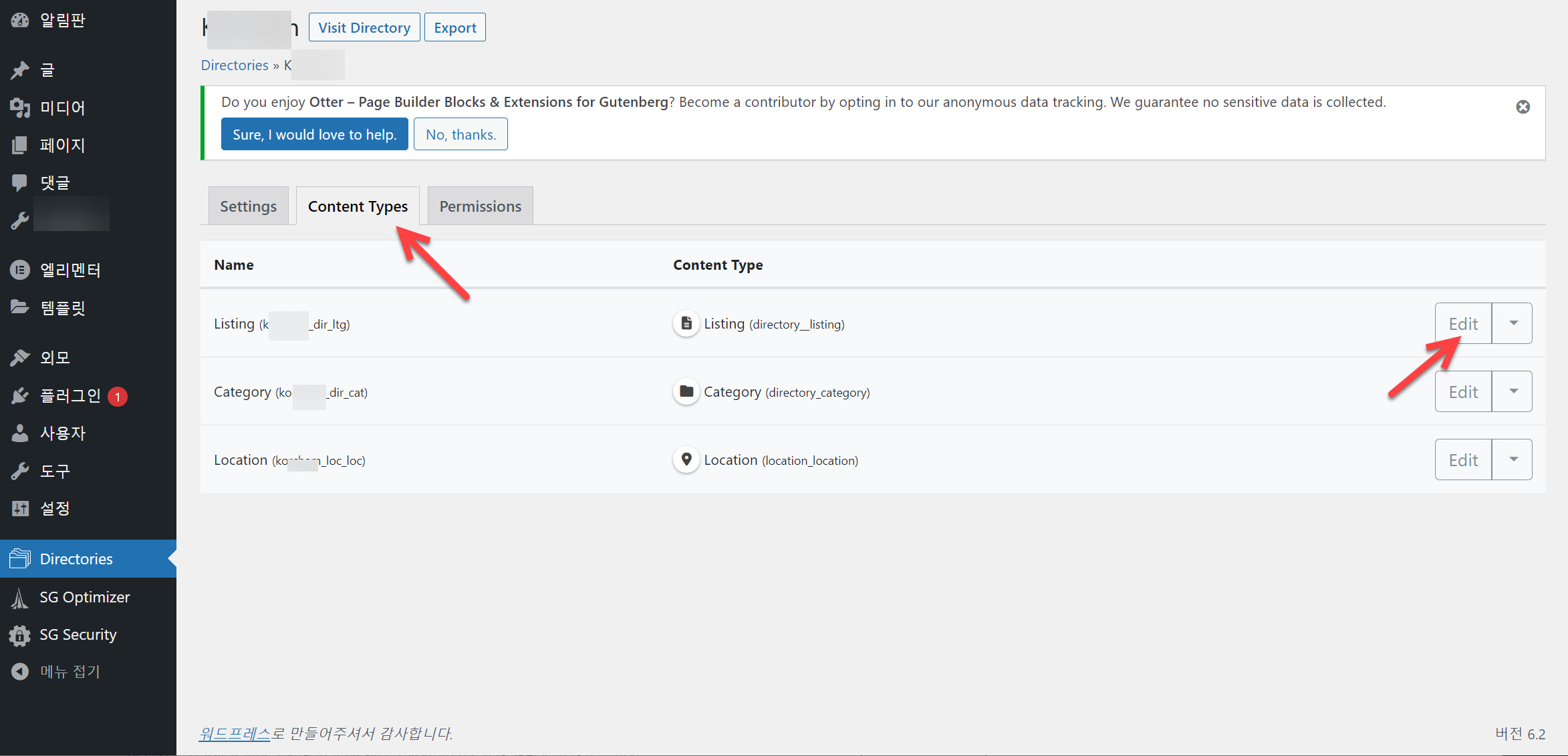 Content Types 탭을 선택하고 Listing의 Edit 버튼을 클릭합니다.