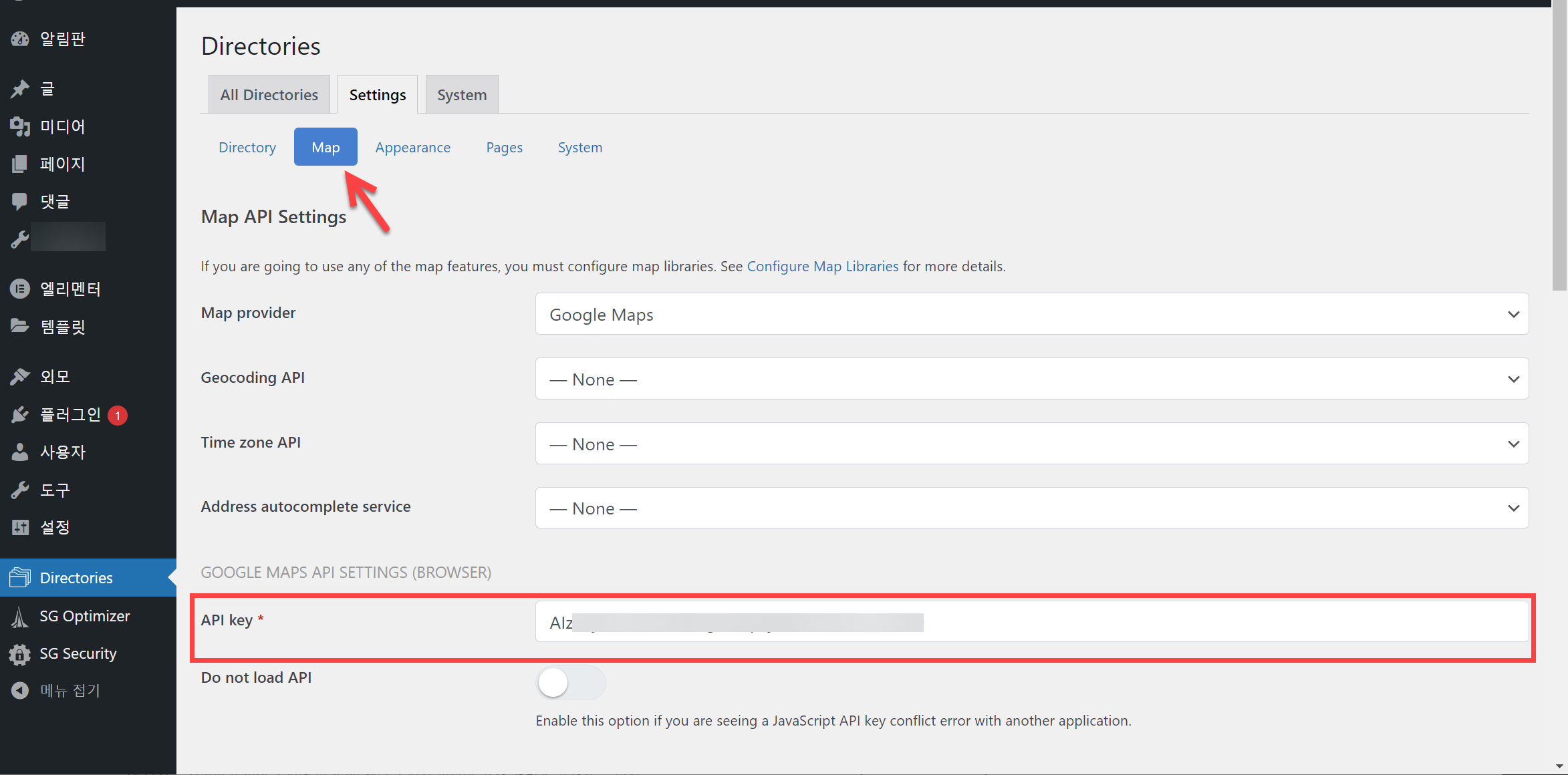 워드프레스 Directories Pro 플러그인에서 구글 지도를 표시하려면 관리자 페이지에서 Directories » Settings » Map을 클릭합니다.