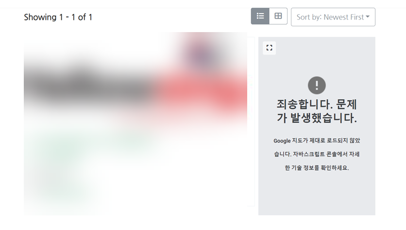 잘못된 API 키가 입력되었거나, 구글 맵 API 설정에서 HTTP 리퍼러에 해당 도메인을 등록하지 않으면 구글 지도 로딩 에러가 발생합니다. API 키가 잘못되면 아래 그림과 같이 "죄송합니다. 문제가 발생했습니다. Google 지도가 제대로 로드되지 않았습니다. 자바스크립트 콘솔에서 자세한 기술 정보를 확인하세요." 오류 메시지가 표시됩니다.