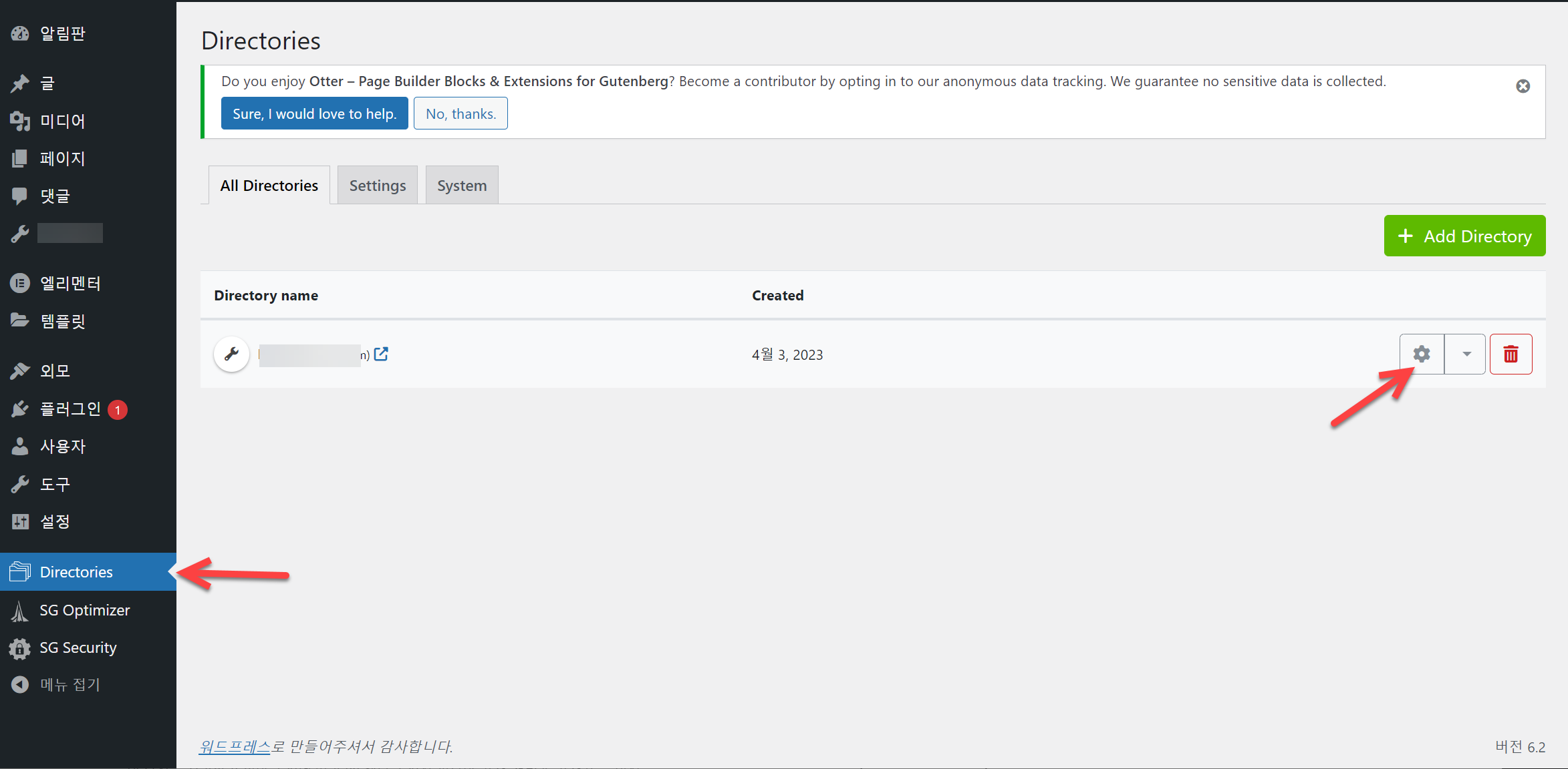 리스팅 포스트에 구글 지도를 표시하려면 Directories 메뉴를 클릭하고 해당 디렉터리의 설정 아이콘(톱니바퀴 모양의 아이콘)을 클릭합니다.