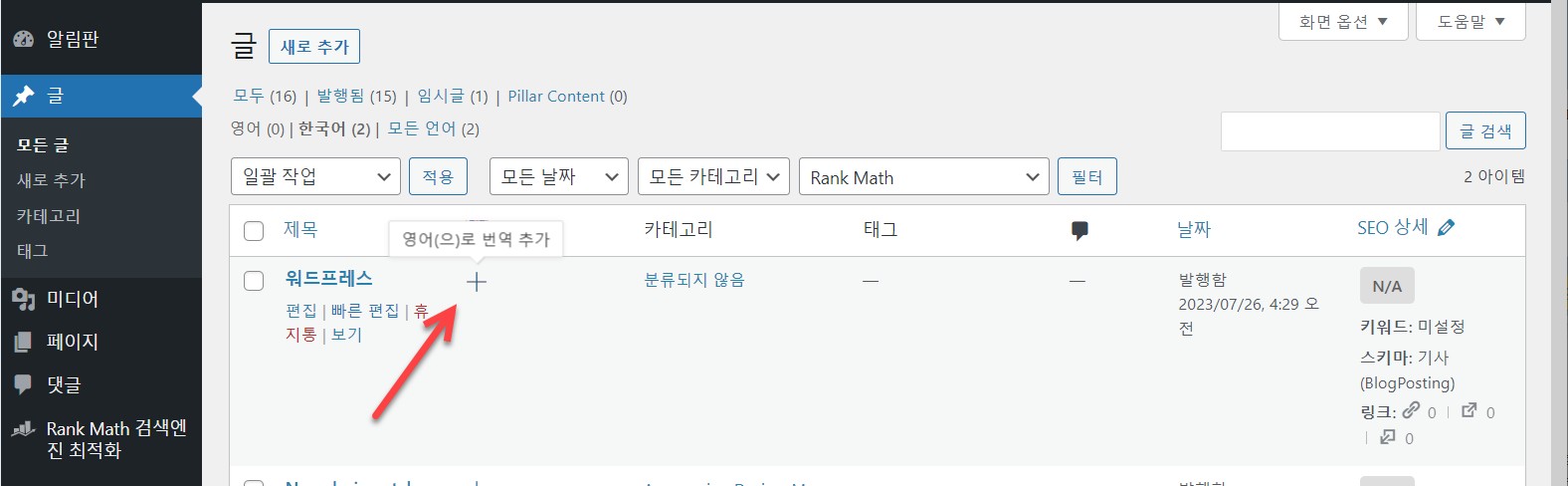 특정 페이지나 글을 다른 언어로 번역하려는 경우 글 » 모든 글(또는 페이지 » 모든 페이지)로 이동하여 번역 추가 아이콘을 클릭합니다.