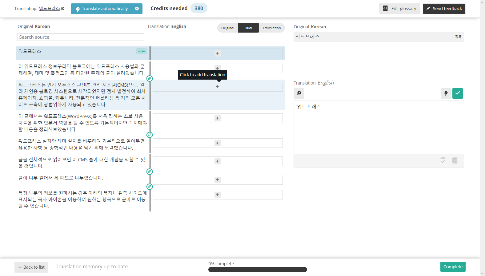 그러면 고급 번역 편집기에서 번역할 수 있습니다. Excel 파일 형식으로 왼쪽에는 원문, 오른쪽에는 번역문이 위치하게 됩니다.