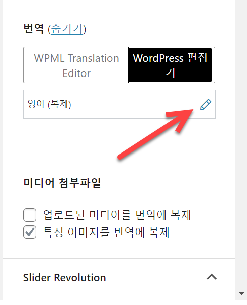 복제된 페이지/블로그 글을 처음 워드프레스 편집기로 열면 오른쪽 패널에 독립적으로 번역할 수 있는 옵션이 표시됩니다.