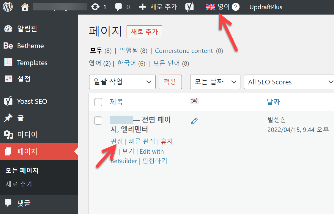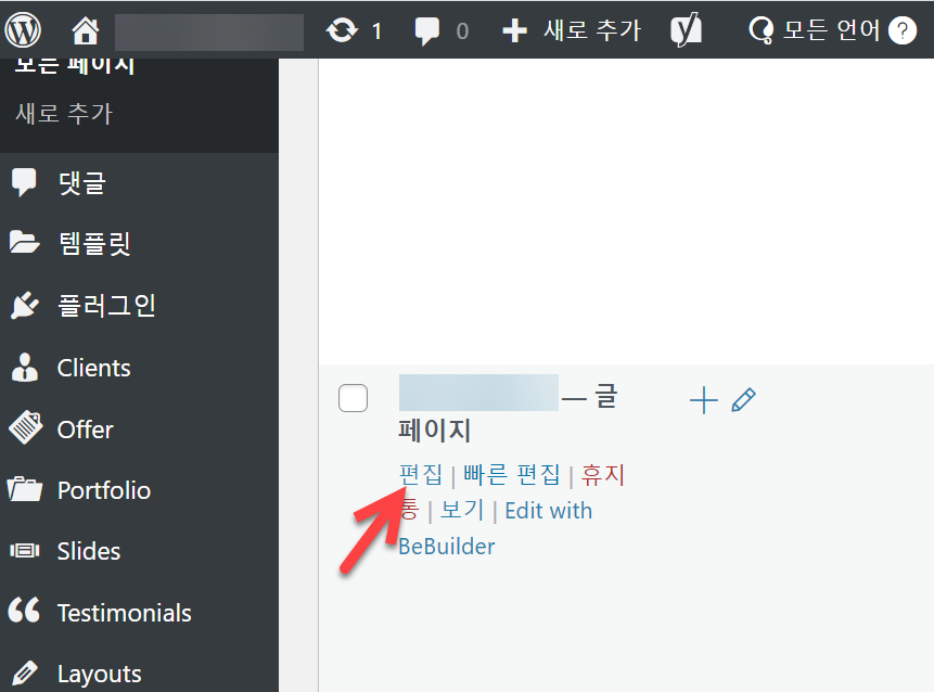 모든 페이지 또는 모든 글 목록에서 번역할 페이지나 글의 제목 위에 마우스를 올려 "편집"을 클릭합니다.