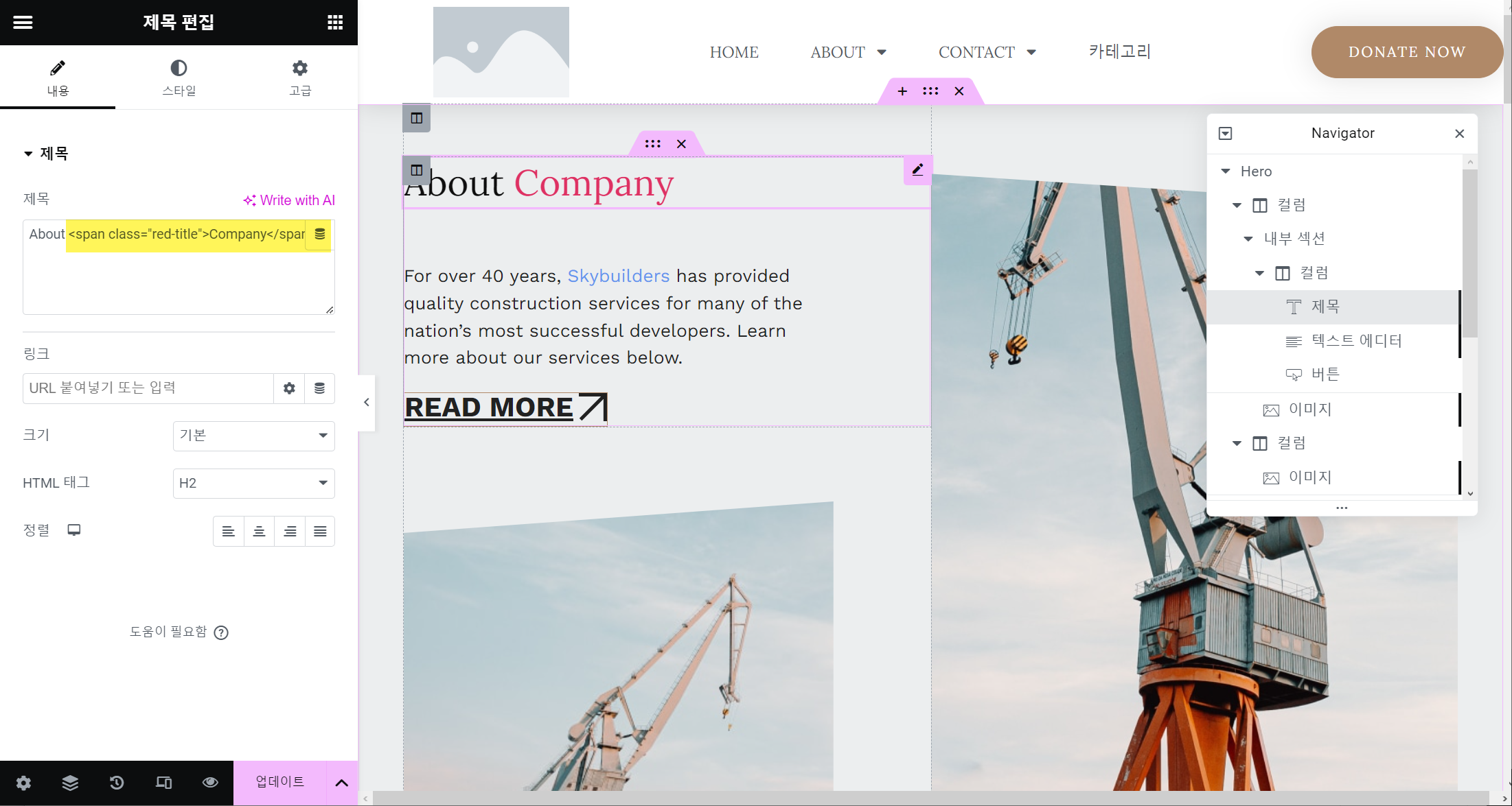 예를 들어, 제목 엘리먼트로 제목을 추가한 경우 "About Company"라는 제목에서 Company 부분만 색상을 다르고 설정해야 하는 상황을 가정해 봅시다.