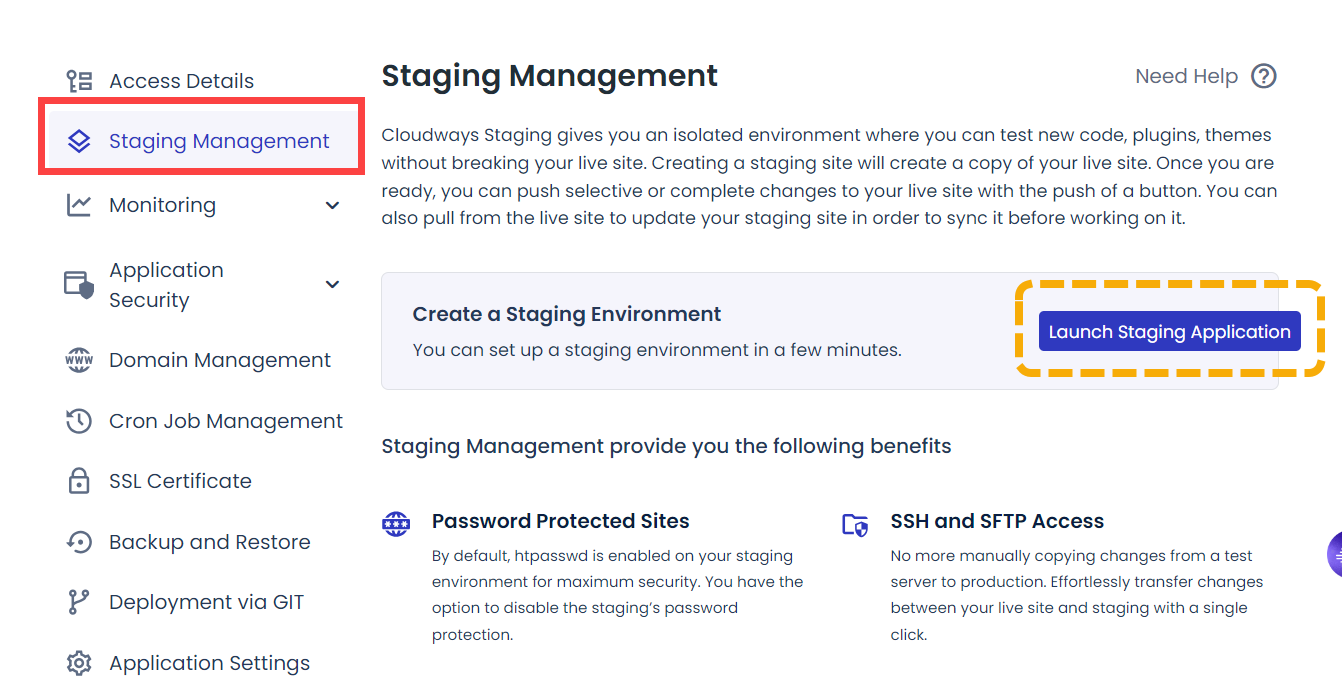 스테이징 앱을 만들면 실 사이트(Live Site)의 복사본을 만들어서 작업 후에 푸쉬 버튼을 클릭하여 스테이징 애플리케이션에서 변경한 사항을 실 사이트에 적용할 수 있습니다.