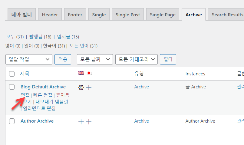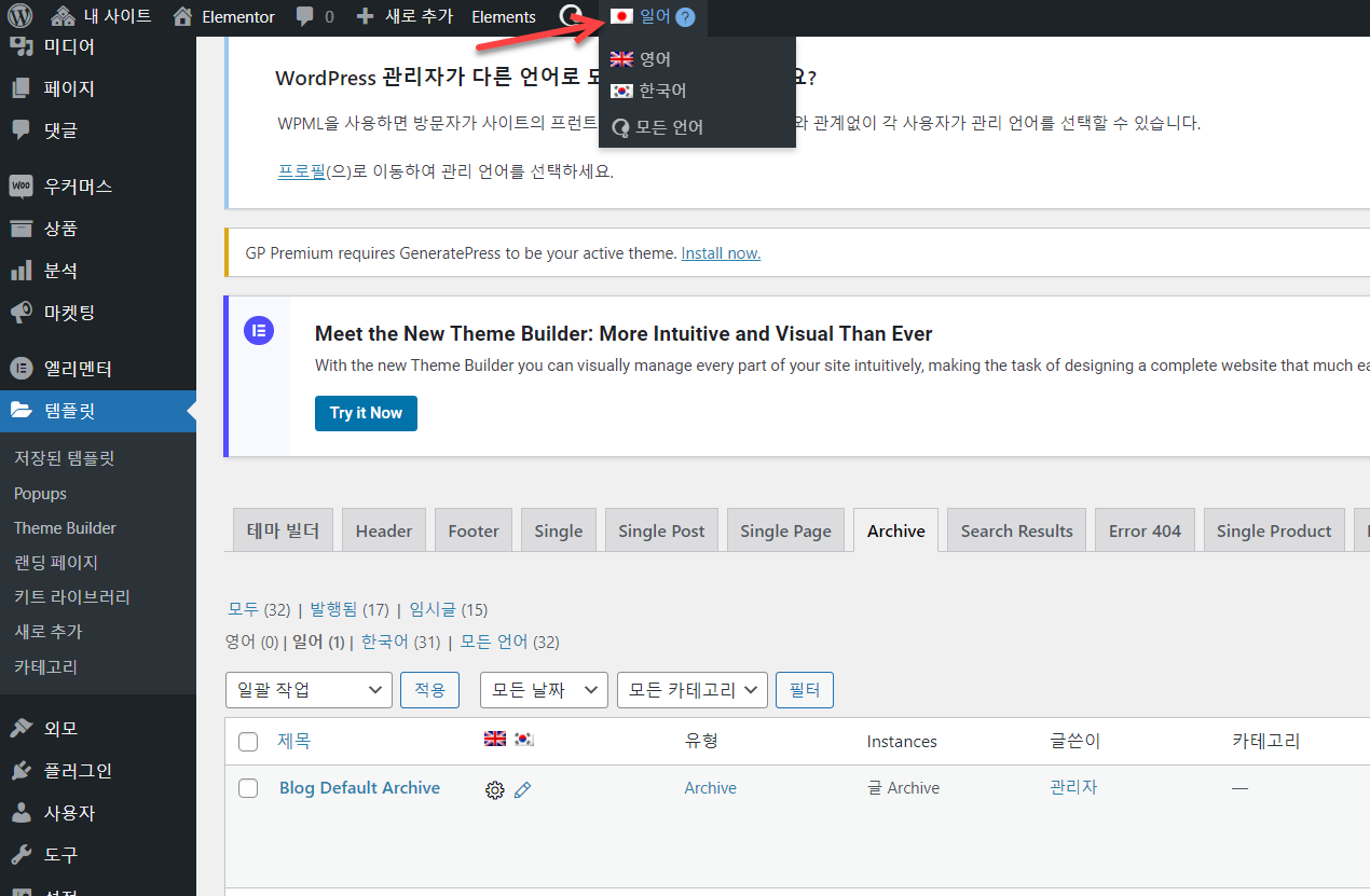 테스트로 일어로 템플릿을 복제해 보았습니다. 상단의 국기에서 일본 국기를 선택하고 엘리멘터 아카이브 템플릿 섹션을 살펴보면 방금 복제한 템플릿이 표시됩니다.