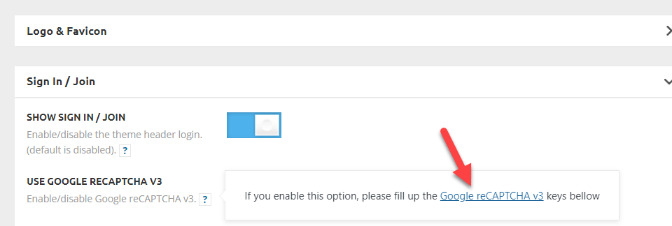 만약 Google reCAPTCHA V3 기능을 사용하고 싶다면 물음포 부분에 마우스를 올린 다음 Google reCAPTCHA v3 링크를 클릭합니다.