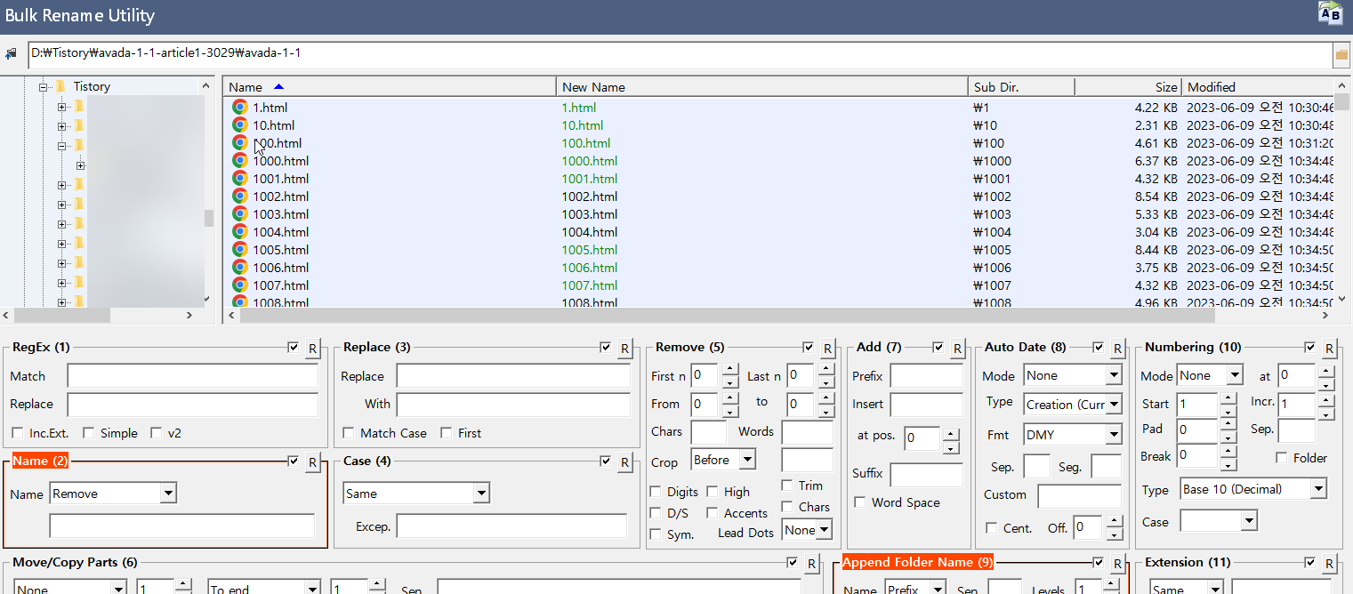 그러면 Rename 버튼(③)이 활성화됩니다. Rename(이름 변경하기) 버튼을 클릭하면 html 파일 이름들이 해당 폴더의 이름으로 바뀌게 됩니다.