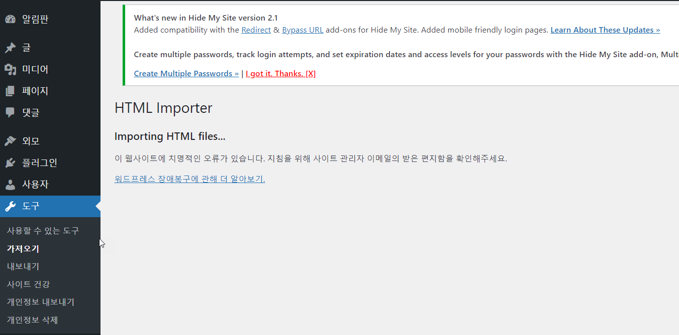 HTML Import 2 플러그인은 6년 이상 업데이트가 안 되고 방치되고 있지만, 최신 워드프레스 버전(워드프레스 6.2.2)에서도 잘 작동했습니다. 하지만 PHP 버전 8.2에서는 작동하지 않았습니다.