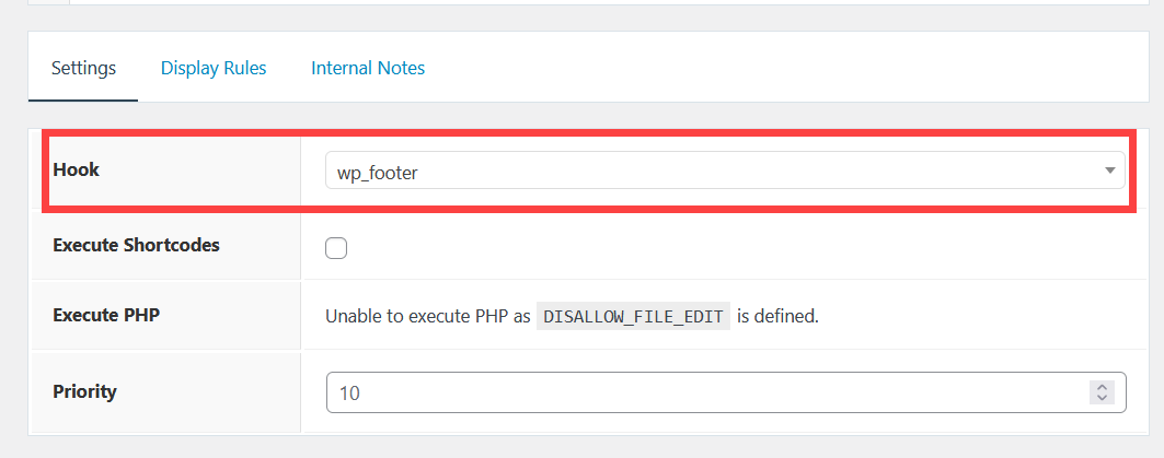 훅(Hook)을 wp_footer로 지정하면 코드가 푸터 영역에 삽입됩니다.