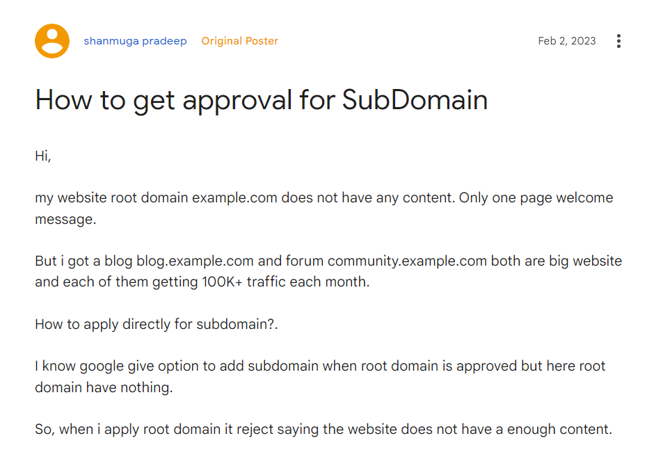 구글 애드센스 커뮤니티에서도 비슷한 질문이 올라오곤 하는데요. 아래는 "메인 도메인 example.com은 원 페이지로 된 환영 페이지이고 블로그 도메인 blog.example.com과 포럼 커뮤니티 도메인 community.example.com은 매월 100만 이상의 트래픽을 기록하고 있다면서 기본 도메인으로 승인 신청을 하면 콘텐츠가 부족하다는 이유로 승인이 거부된다고 합니다. 이 상황에서 서브도메인에 대하여 승인 신청을 할 수 있는지" 문의하고 있습니다.