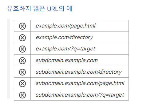 상기는 구글에서는 제시하고 있는 유효한 URL과 유효하지 않은 URL의 예입니다("애드센스 계정을 만들 때 URL을 입력하는 방법").