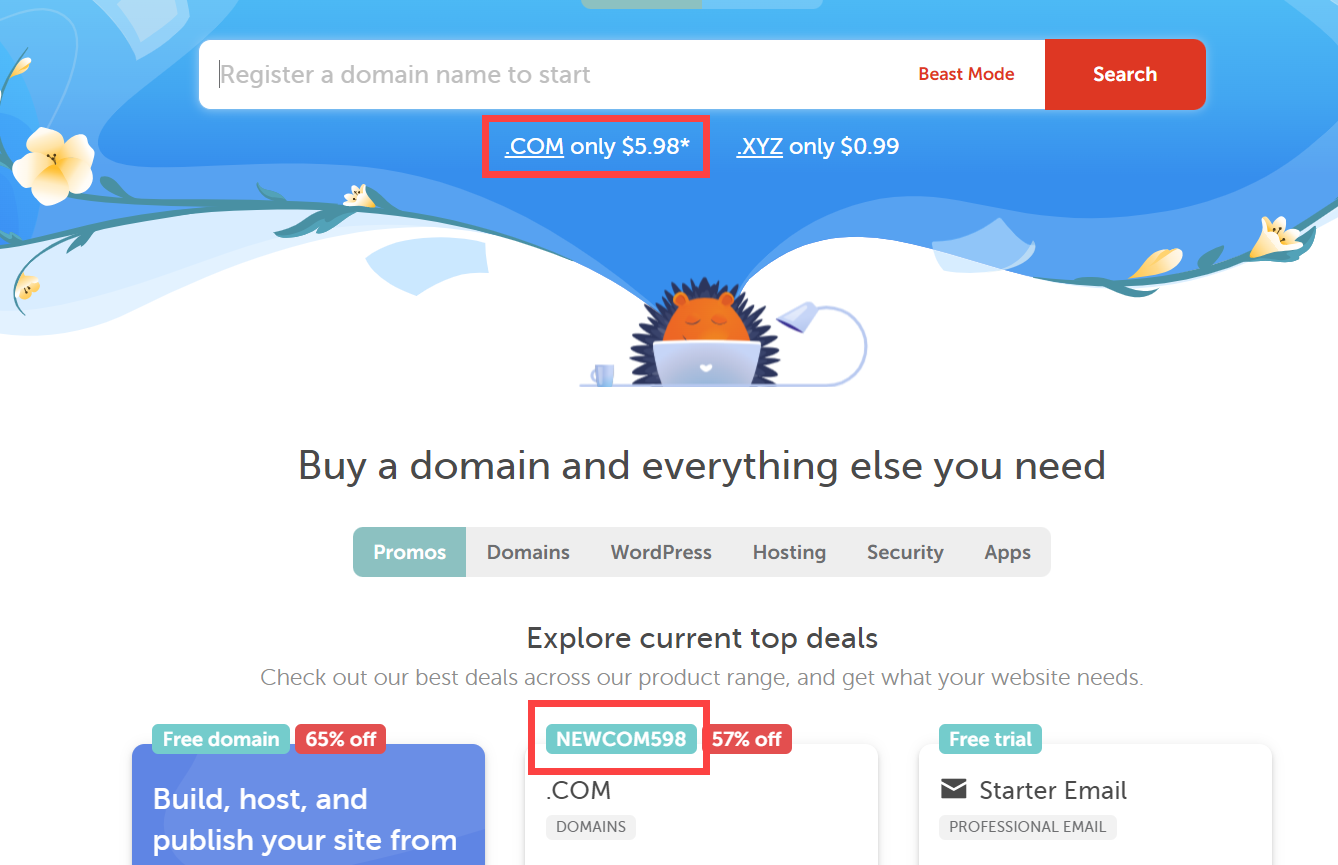 닷컴(.COM) 도메인 등록 시 NEWCOM598 쿠폰 코드를 입력하면 57% 할인된 5.98달러에 등록이 가능합니다.