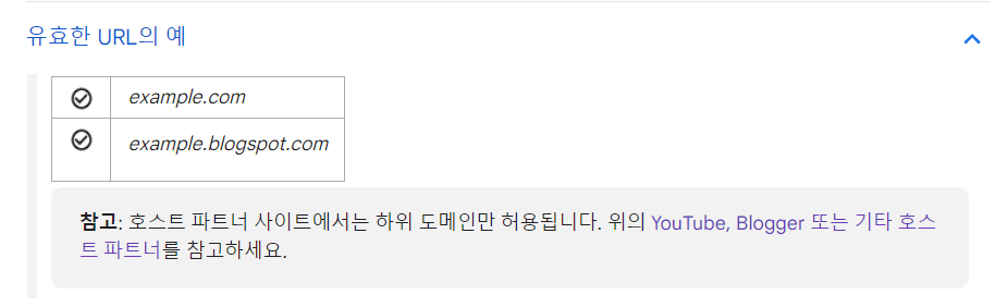 티스토리나 구글 블로그스팟 블로그의 경우 서브도메인(example.tistory.com, example.blogspot.com)에 대하여 승인을 요청할 수 있습니다. 여기에 대하여 구글 문서에서는 "호스트 파트너 사이트에서는 하위 도메인만 허용됩니다"라고 안내하고 있습니다.