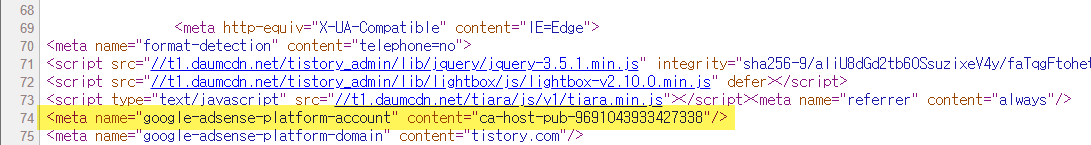 애드센스 계정 연동을 해제해도 카카오의 PUB 코드가 헤더 섹션에 삽입되어 있네요. (아직 애드센스 광고를 표시하지 않는 블로그에 대해서는 티스토리 자체 광고를 표시하지 않고 있습니다. 만약 추후에 애드센스 광고를 표시하지 않는 블로그에 대해서도 자체 광고를 게재한다면 워드프레스로 이사하는 것에 대하여 진진하게 고민할 것 같습니다.)