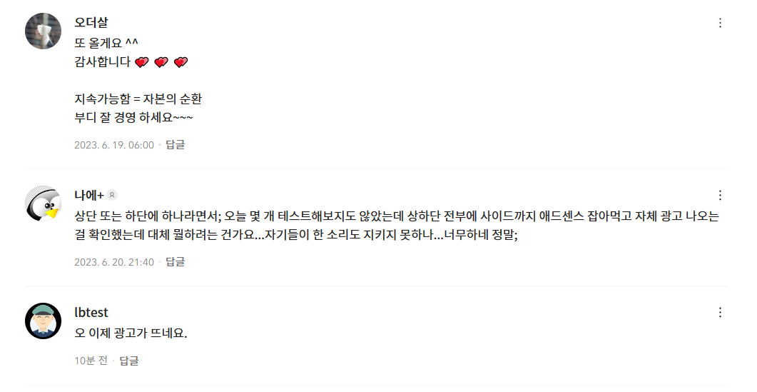 본문 상단 또는 하단에 자체 광고를 표시할 예정이라고 하네요. 아마도 카카오의 애드센스 광고를 표시할 것으로 보입니다. 현재 자체 광고가 표시되는 것 같습니다.
