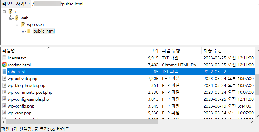 저는 FTP에 접속하여 robots.txt 파일을 만들어서 내용을 추가하는 방법으로 robots.txt 파일을 생성했습니다.