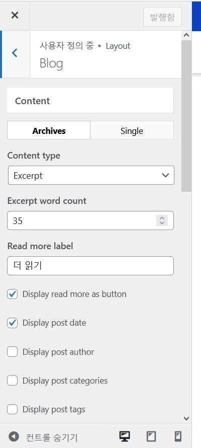 위의 그림에서와 같이 Blog 섹션에는 Content Type(콘텐츠 유형)을 지정하는 옵션만 제공됩니다. Content Type으로 Full Content(전체 콘텐츠)와 Excerpt(요약문) 중에서 선택이 가능합니다.