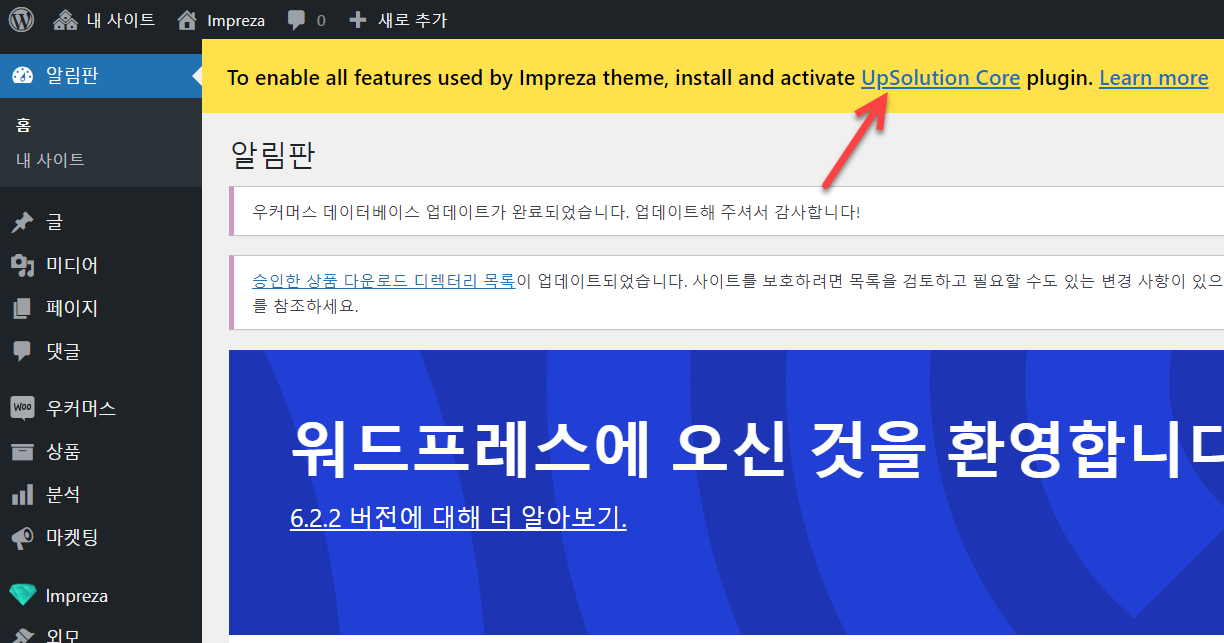 이제 Impreza 테마가 설치된 하위 블로그의 관리자 페이지에 접속하면 아래 그림과 같이 "To enable all features used by Impreza theme, install and activate UpSolution Core plugin" 경고가 표시됩니다.