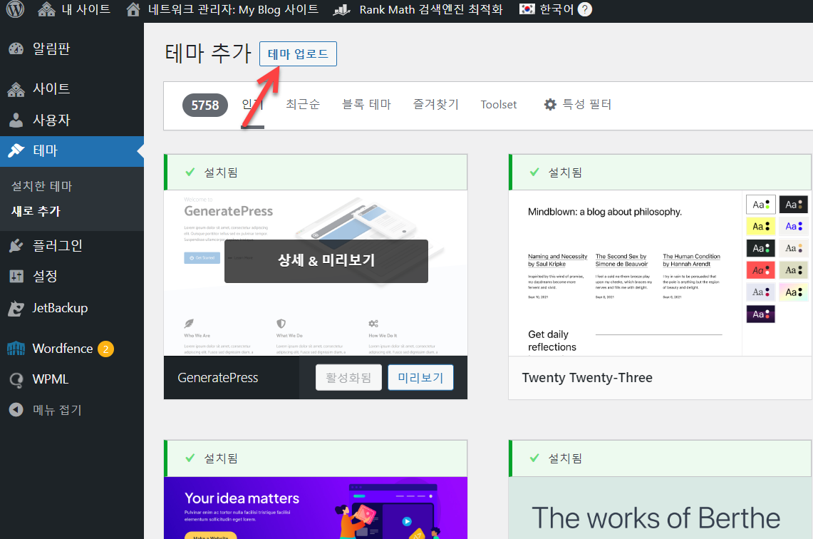 이미 동일 테마가 설치되어 있다면 "대상 폴더가 이미 존재합니다. ....이 테마를 이미 설치했습니다(이 테마는 이미 설치되어 있습니다)" 메시지가 표시됩니다.
