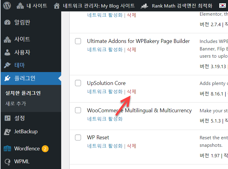 임프레자 테마의 경우 테마를 업데이트하면 코어 플러그인도 함께 업데이트됩니다. 멀티사이트에서는 Impreza 테마를 업데이트해도 코어 플러그인은 해당 테마가 설치된 하위 블로그의 관리자 페이지에서 업데이트를 할 수 없는 버그가 있는 것 같습니다. 이 경우, 네트워크 관리자 페이지의 플러그인 » 설치한 플러그인으로 이동하여 UpSolution Core 플러그인을 삭제합니다.