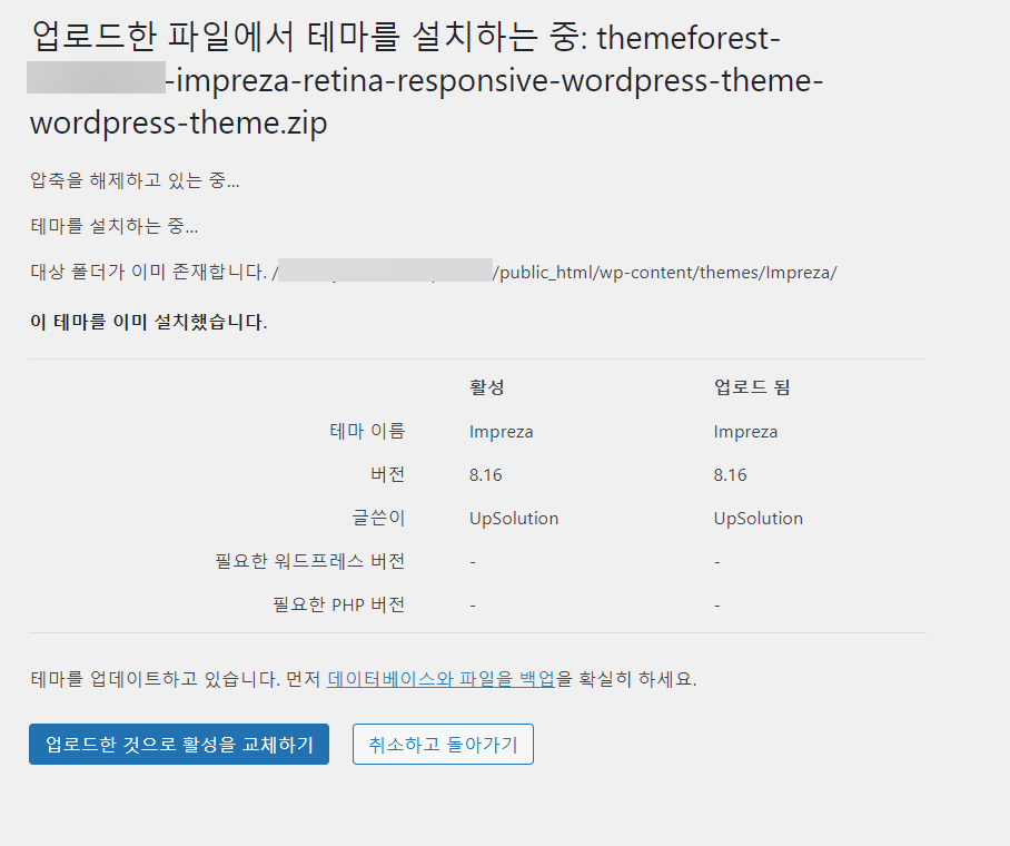 위의 그림에서는 버전이 8.16으로 동일한데요. 만약 업로드한 버전이 최신 버전이라면 "업로드한 것으로 활성을 교체하기" 버튼을 클릭하여 업로드한 테마를 설치합니다.