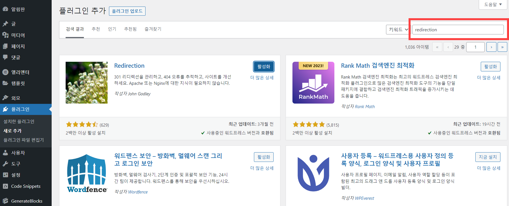 이 플러그인은 플러그인 » 새로 추가로 이동하여 "redirection"을 검색하여 설치할 수 있습니다.